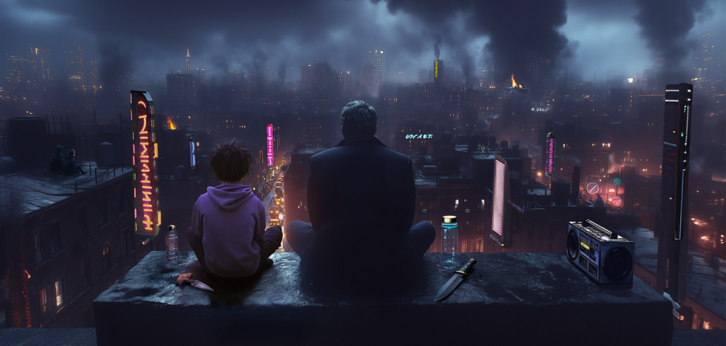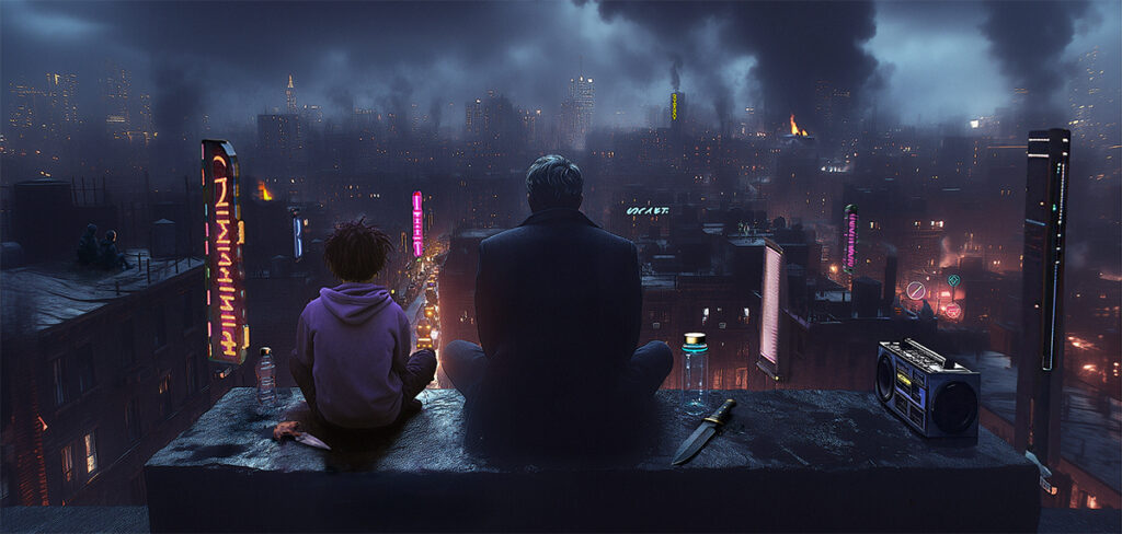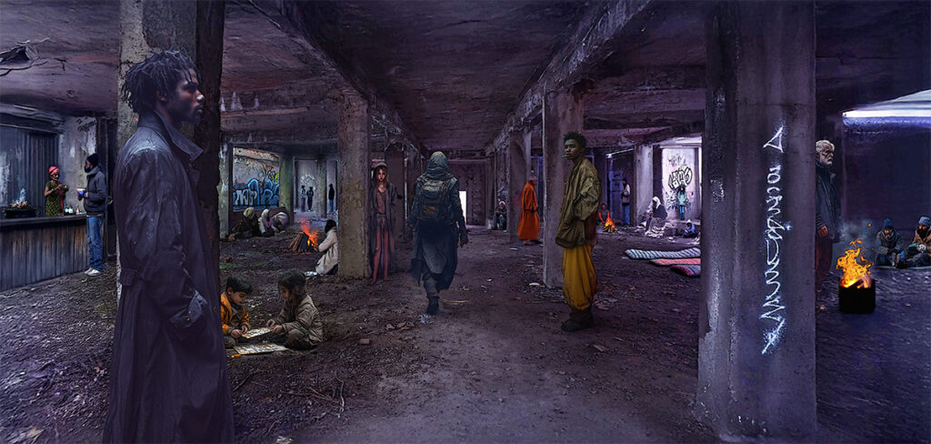 Although these images represent scenes from that story, the graphic novel has not yet been drawn by comic book artists. That day will soon come, but for now these panels are design ideas to inspire and give an overall view of the feeling and vibe of the dark world this dystopian tale takes place in. Special thanks to musician and creative brother Bob Madsen for your continued support of this project, and for introducing Kevin and Dan, paving the way for this collaboration!